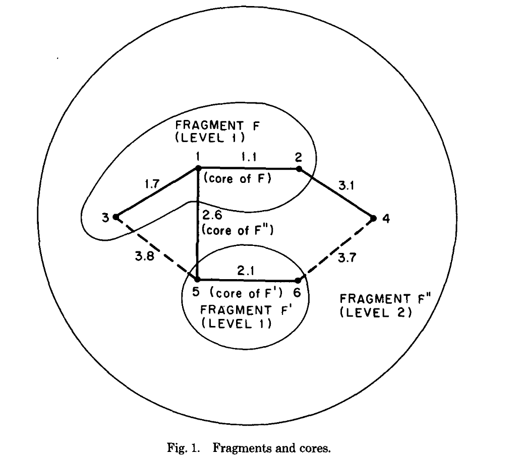 在接下来的算法中,每个片段独立于其他片段异步地寻找其最小权重出边,并且当找到该边时,该片段尝试与位于该边另一端的片段合并。合并的方式和时间取决于两个片段的层级,而层级又取决于之前的片段合并。具体来说,包含单个节点的片段被定义为层级0。假设一个给定的片段 F 处于层级 L \geq 0,并且位于 F 的最小权重出边另一端的片段 F’ 处于层级 L’。如果 L \lt L’,则片段 F 立即作为片段 F’ 的一部分被吸收,扩展后的片段处于层级 L’。如果 L = L’ 且片段 F 和 F’ 具有相同的最小权重出边,则这两个片段立即合并成一个新的层级为 L + 1 的片段;该合并边随后被称为新片段的核心(core)。在所有其他情况下,片段 F 只是等待,直到片段 F’ 达到足够高的层级以便根据上述规则进行合并。