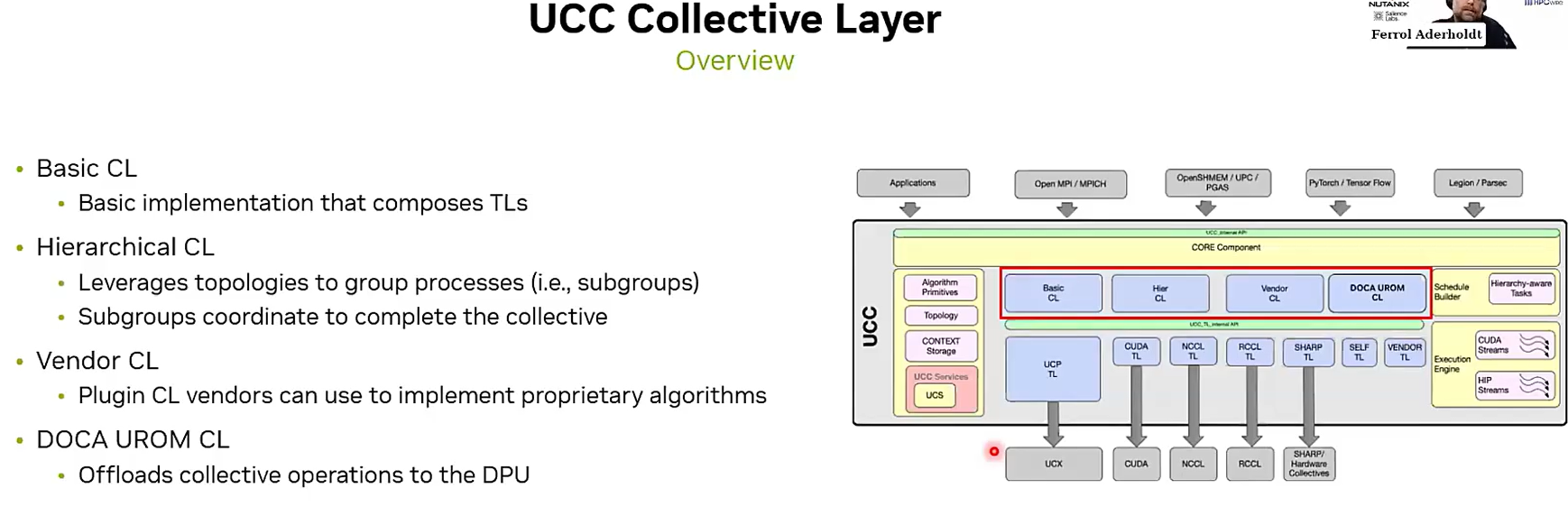 集体通信用于进程间的数据交换与同步,无论是在HPC领域还是DL领域都非常重要。但现有通信库各自优化专有硬件。UCC希望统一 CPU、GPU、DPU 上的集体通信、支持多种编程模型、整合软件与硬件传输机制。