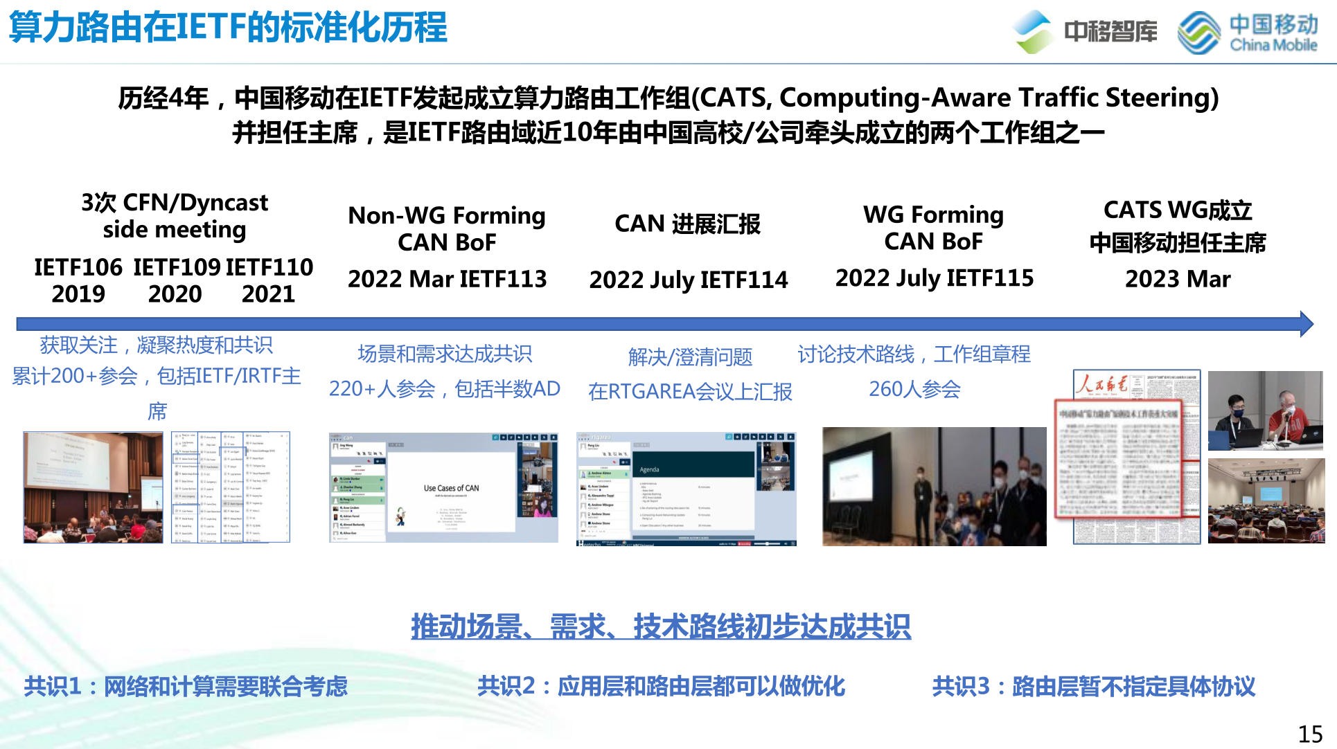2023年3月,中国移动在国际互联网工程任务组IETF牵头成立了算力路由(CATS,Computing Aware Traffic Steering)工作组并担任工作组主席,引领全球算力路由标准的制定。